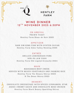 Join us for an unforgettable evening as Hentley Farm partners with Mrs Q for a five-course modern Asian dining experience perfectly paired with a selection of our finest wines.
